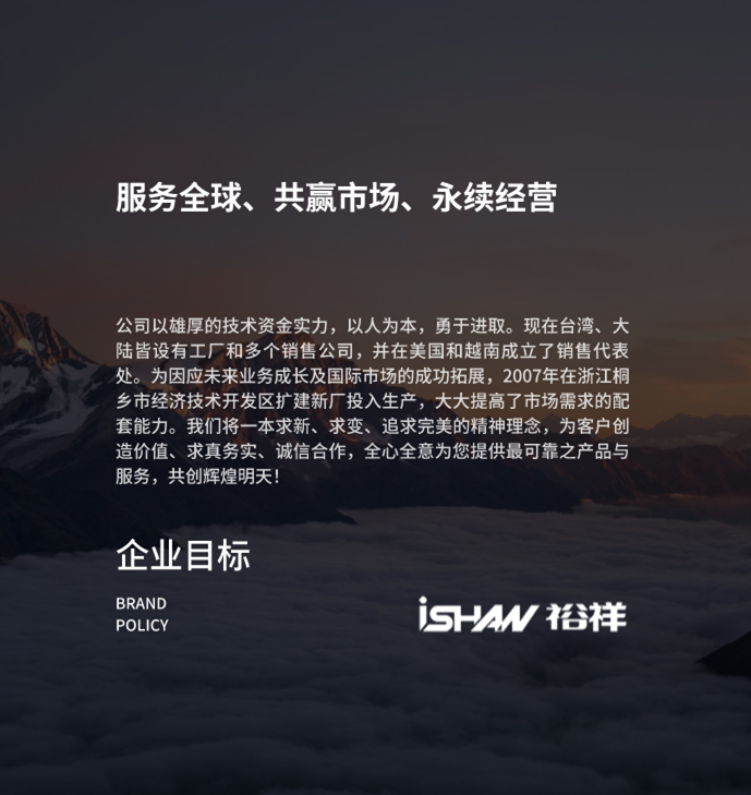 With strong technical and financial strength, the company is people-oriented and enterprising. Now there are factories and sales companies in Taiwan and China, and sales representative offices in the United States and Vietnam. In order to cope with the future business growth and the successful expansion of the international market, the new factory was expanded in Tongxiang Economic and Technological Development Zone, Zhejiang Province, and put into production in 2007, greatly improving the supporting capacity of market demand. With the spirit of seeking innovation, change and perfection, we will create value for customers, be realistic and pragmatic, and cooperate in good faith, wholeheartedly provide you with the most reliable products and services, and create a brilliant tomorrow span>